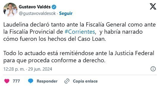 La versión falsa fue rápidamente respaldada en redes sociales por el propio gobernador, Gustavo Valdés, quien publicó un tuit afirmando que se había solucionado el caso Loa. Laudelina había dicho que fue atropellado y enterrado.