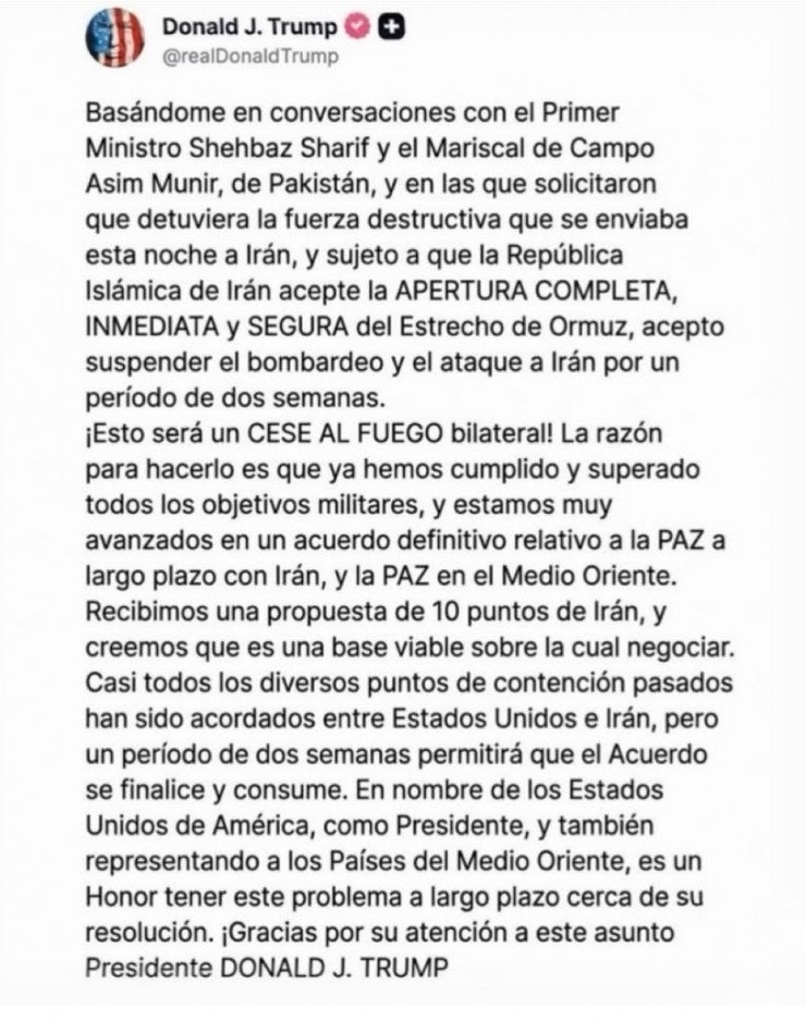 Sin embargo, pocas horas después, el mismo canal fue utilizado para introducir un giro significativo. “He decidido retrasar la decisión por dos semanas para ver si hay una posibilidad de negociación”, escribió Trump. La secuencia, leída en conjunto, revela una fisura: de la amenaza de aniquilación total a una pausa condicionada en cuestión de horas.