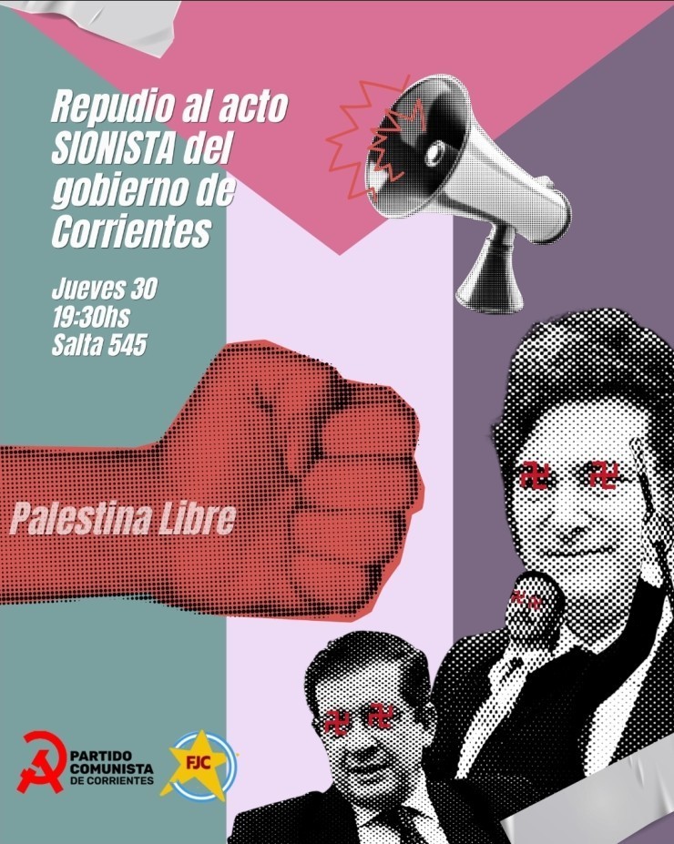 En paralelo, la convocatoria en Salta 545 apuntará directamente contra la decisión del gobierno encabezado por Juan Pablo Valdes  y el vicegobernador, Pedro Braillard Poccard,  de realizar un acto oficial en homenaje a Israel, en línea con la política exterior del presidente Milei.